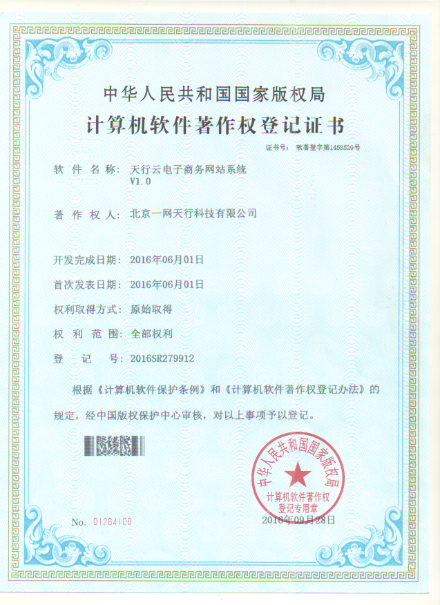 一網(wǎng)天行網(wǎng)站建設(shè)公司自主研發(fā)產(chǎn)品《天行云電子商務(wù)網(wǎng)站系統(tǒng)》獲得國家版權(quán)局計(jì)算機(jī)軟件著作權(quán)登記證書